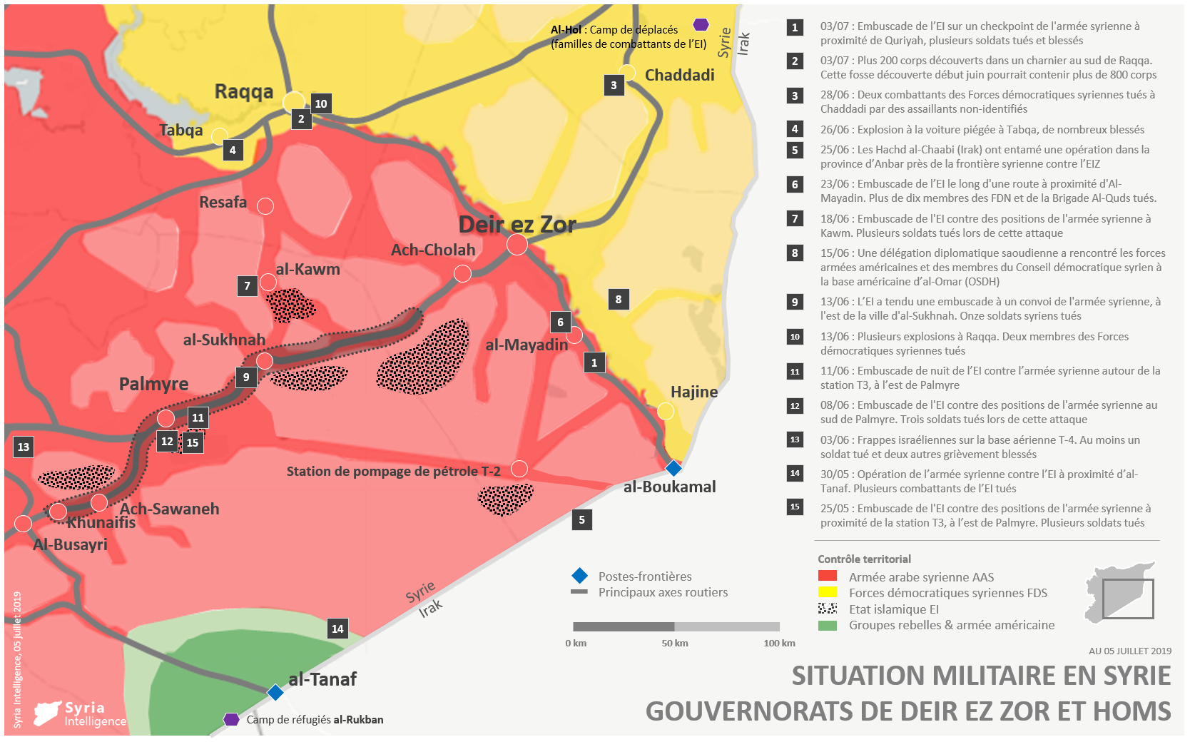 23/06 : Embuscade de l’EI le long d’une route à proximité d’Al-Mayadin. Plus de dix membres des FDN et de la Brigade Al-Quds tués.