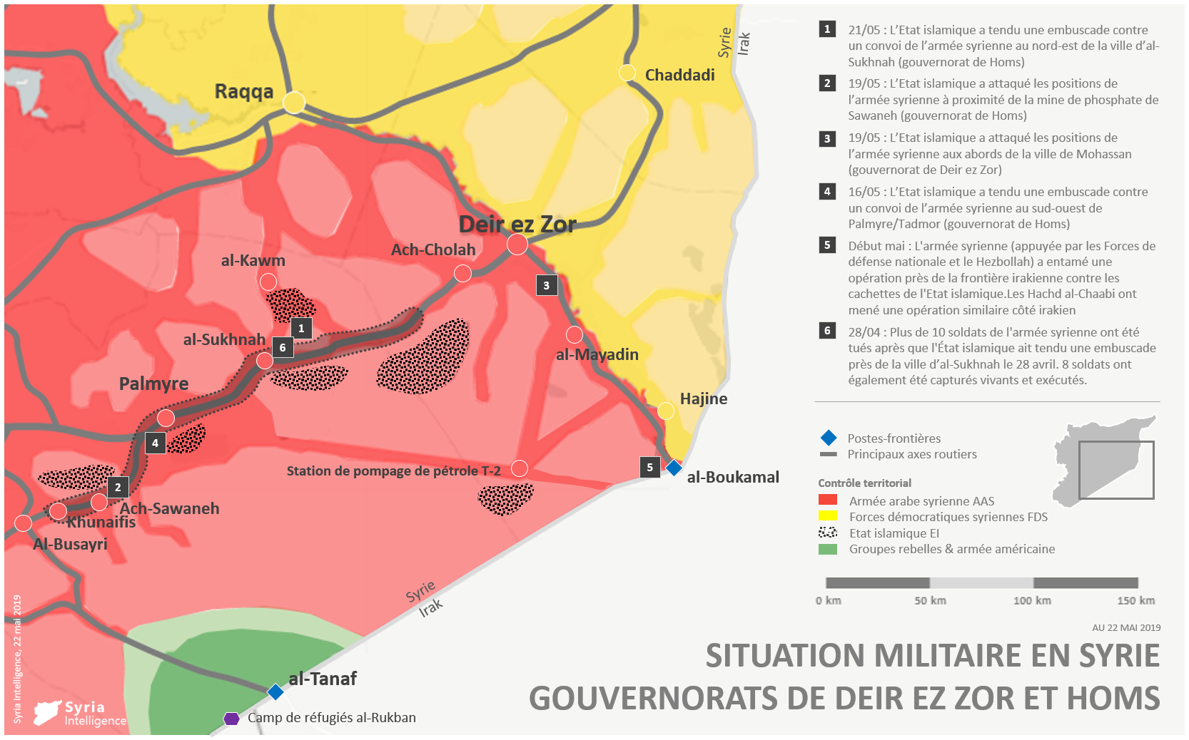 Début mai : L’armée syrienne (appuyée par les Forces de défense nationale et le Hezbollah) a entamé une opération près de la frontière irakienne contre les cachettes de l’Etat islamique. Les Hachd al-Chaabi ont mené une opération similaire côté irakien