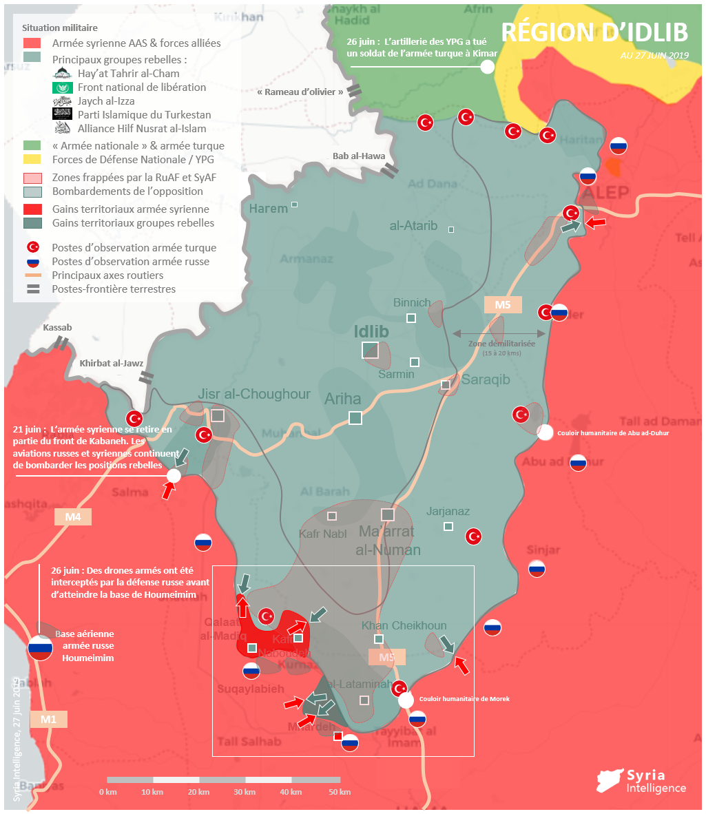 Situation militaire dans la région d’Idlib au 27 juin 2019 27 juin 2019 Syria Intelligence Cartes du conflit Situation militaire dans la région d’Idlib Pour voir la carte détaillée du front de Hama, cliquez ici. Similaire