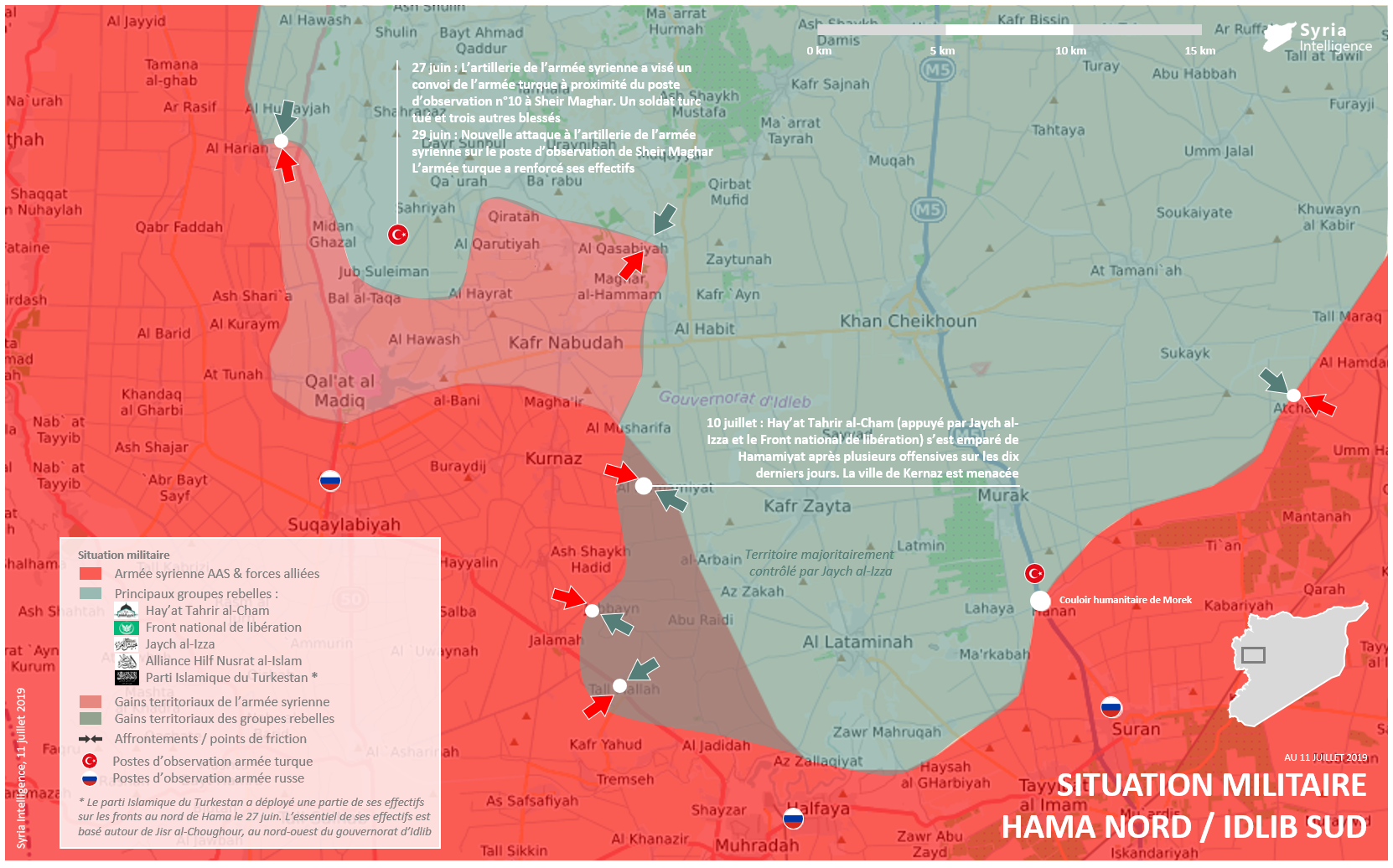 Appuyé par Jaych al-Izza et le Front national de libération, Hay’at Tahrir al-Cham s’est emparé de Hamamiyat dans la nuit du 11 juillet après plusieurs tentatives sur les dix derniers jours. Contre-offensive en cours des forces armées syriennes pour reprendre le village. La ville de Kernaz est menacée.