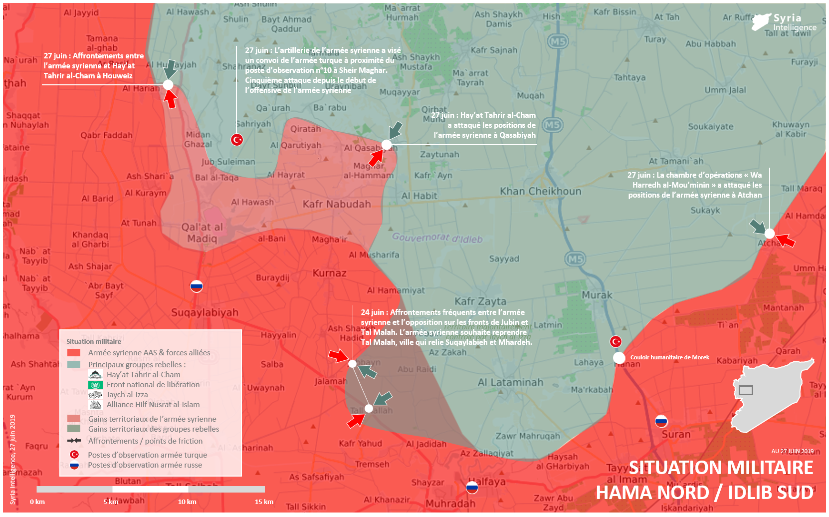 Situation militaire dans le gouvernorat de Hama au 27 juin 2019 : Carte détaillée du front de Hama 27 juin 2019 Syria Intelligence Cartes du conflit Carte détaillée de la situation militaire à Hama nord, Idlib Sud au 27 juin 2019 Etat des lieux des dernières opérations militaires depuis le lancement de l’offensive terrestre de l’armée syrienne au nord de Hama le lundi 6 mai. Similaire
