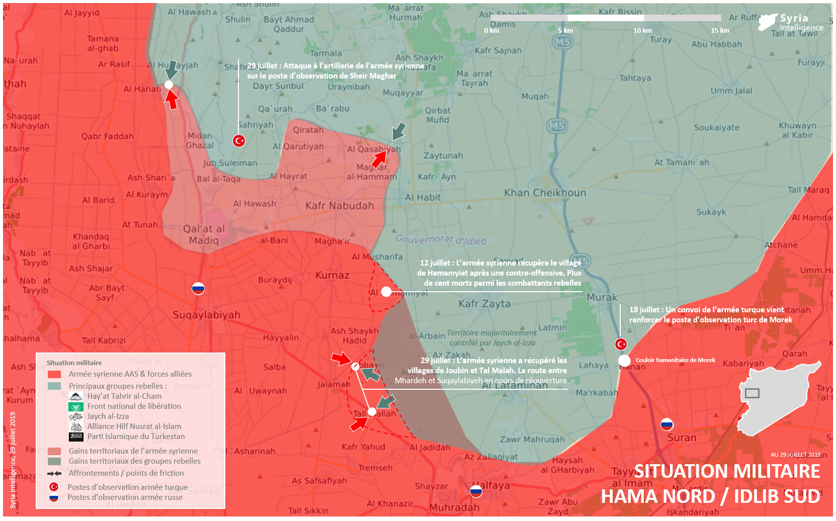 Situation militaire dans le gouvernorat de Hama : L’armée syrienne a repris le contrôle des villages de Joubin et Tal Malah 29 juillet 2019 Syria Intelligence Cartes du conflit Carte détaillée de la situation militaire à Hama nord, Idlib sud au 29 juillet 2019 Carte détaillée de la situation militaire dans le gouvernorat de Hama. L’armée syrienne a repris le contrôle des villages de Joubin et Tal Malah. Similaire