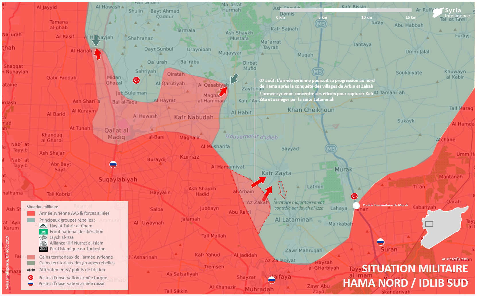 L’armée syrienne continue sa progression au nord de Hama après la fin du cessez-le-feu négocié le 2 août. Elle concentre ses efforts sur Kafr Zita pour ensuite assiéger Lataminah (sous contrôle de Jaych al-Izza et Hay’at Tahrir al-Cham).