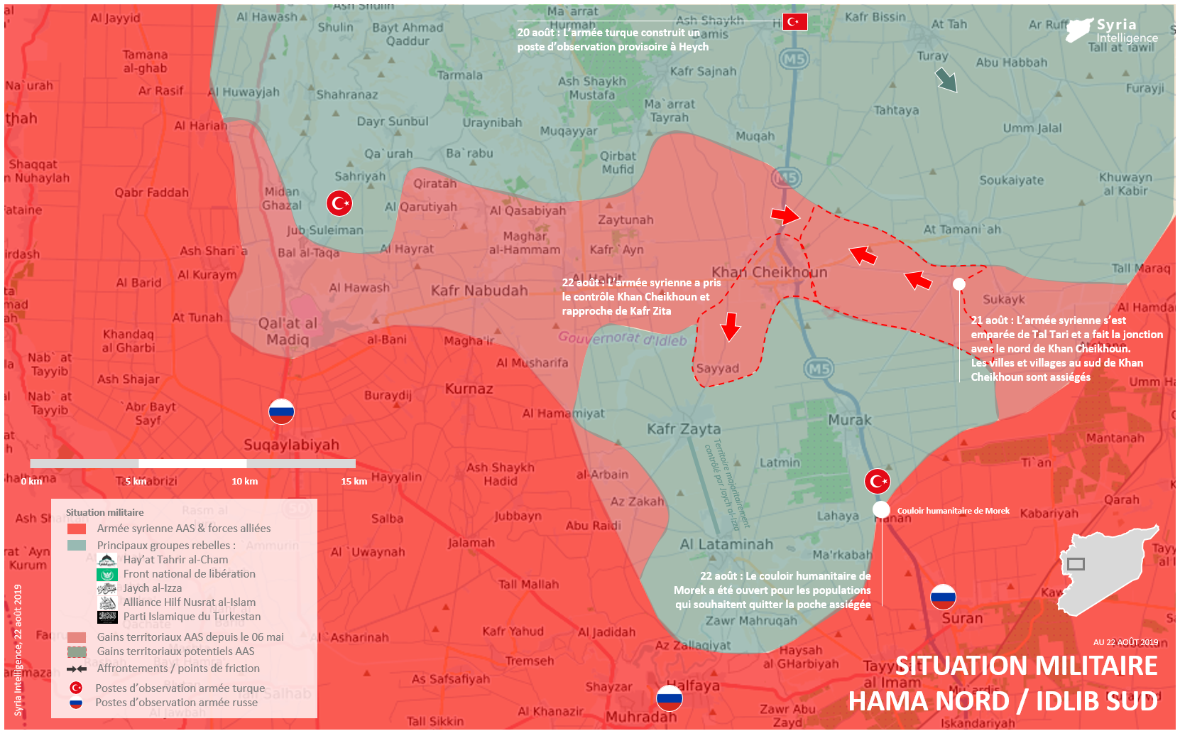 Situation militaire dans les gouvernorats de Hama et Idlib : La ville de Khan Cheikhoun est officiellement sous contrôle de l’armée syrienne. Un couloir humanitaire a été ouvert pour les populations souhaitant quitter la poche rebelle assiégée.