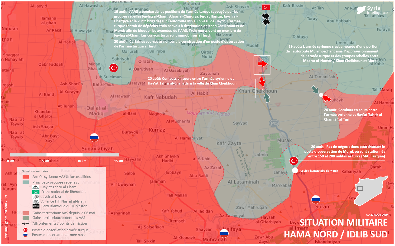 Situation militaire dans les gouvernorats de Hama et Idlib : Combats en cours à Khan Cheikhoun et Tal Tari entre l’armée syrienne et groupes djihadistes. La Turquie refuse d’évacuer son personnel militaire du poste d’observation de Morek qui risque d’être encerclé.