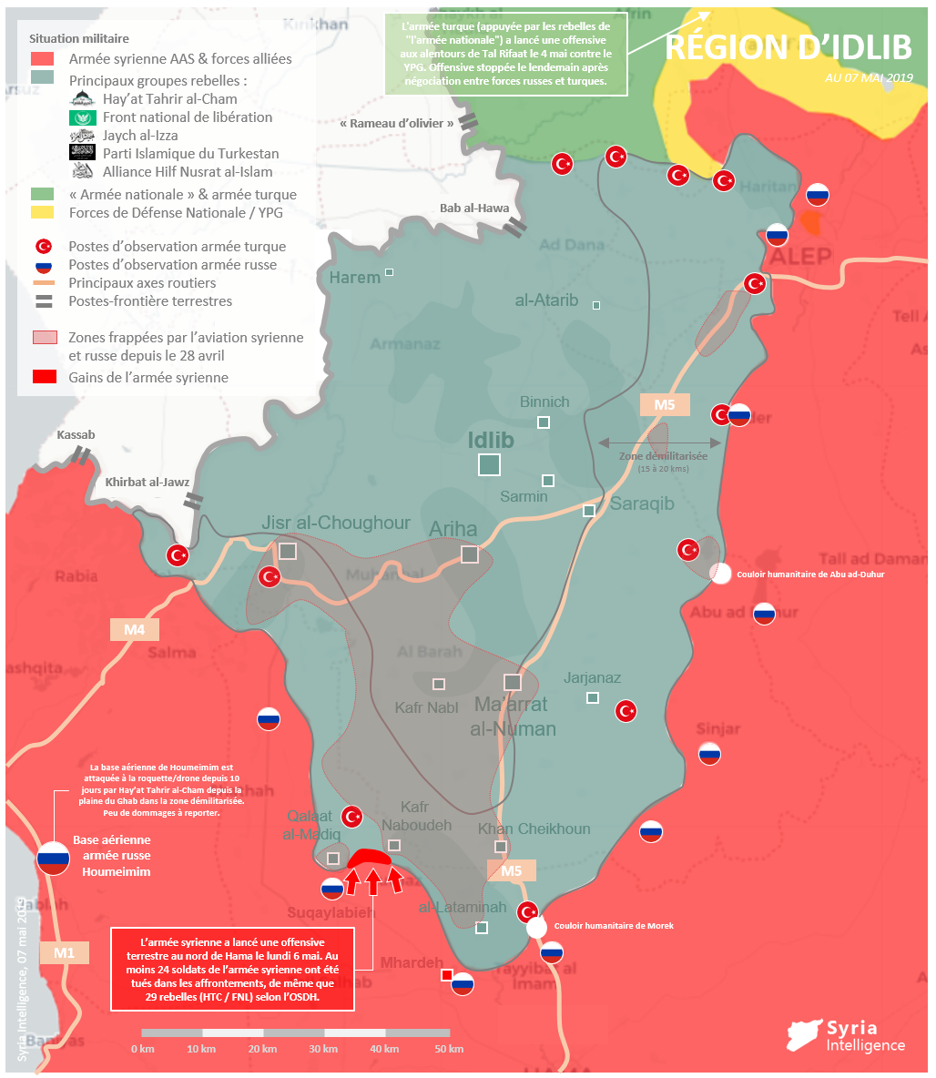 L’armée syrienne a lancé ce lundi une offensive terrestre limitée au nord de Hama après dix jours de bombardements intensifs de l’aviation syrienne et russe. Au moins 24 soldats de l’armée syrienne ont été tués dans les affrontements, de même que 29 rebelles de Hay’at Tahrir al-Cham et du Front national de libération selon l’OSDH.