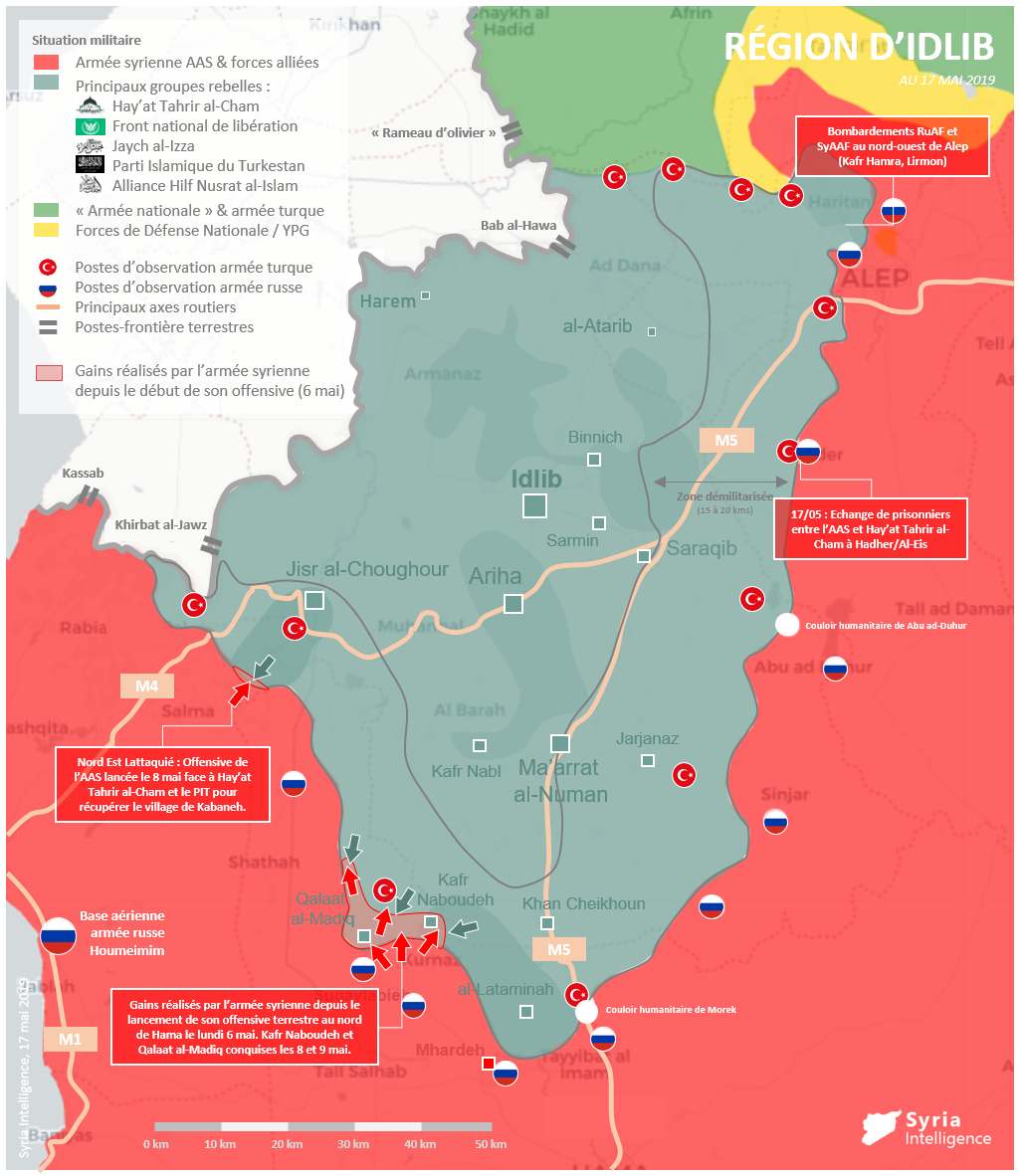 Les gains réalisés par l’armée syrienne depuis le lancement de son offensive terrestre au nord de Hama le lundi 6 mai. Les villes de Kafr Naboudeh et Qalaat al-Madiq ont été conquises les 8 et 9 mai.