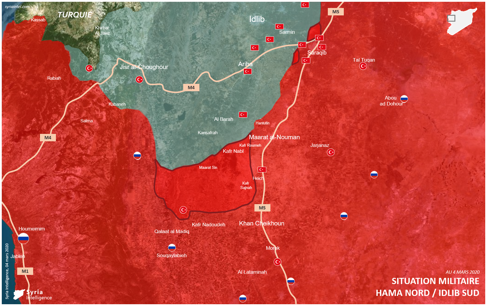 L’armée syrienne sécurise le nord de Saraqib avec la capture du village de Afes. Les groupes rebelles soutenus par la Turquie ont lancé une contre-offensive à l’ouest de Saraqib ce mercredi, sans succès.