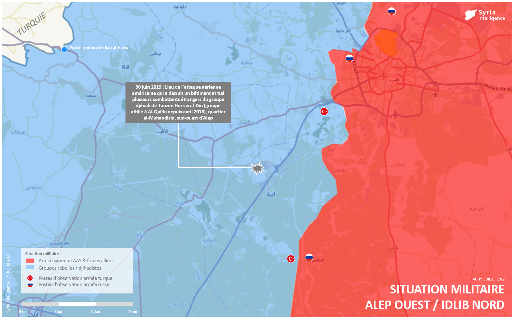 L’OSDH rapporte que huit membres du groupe djihadiste Tanzim Hurras al-Din ont été tués durant les bombardements américains ce dimanche dans le sud-ouest du gouvernorat d’Alep, dont six commandants (deux algériens, deux tunisiens, un égyptien et un syrien) et deux combattants.